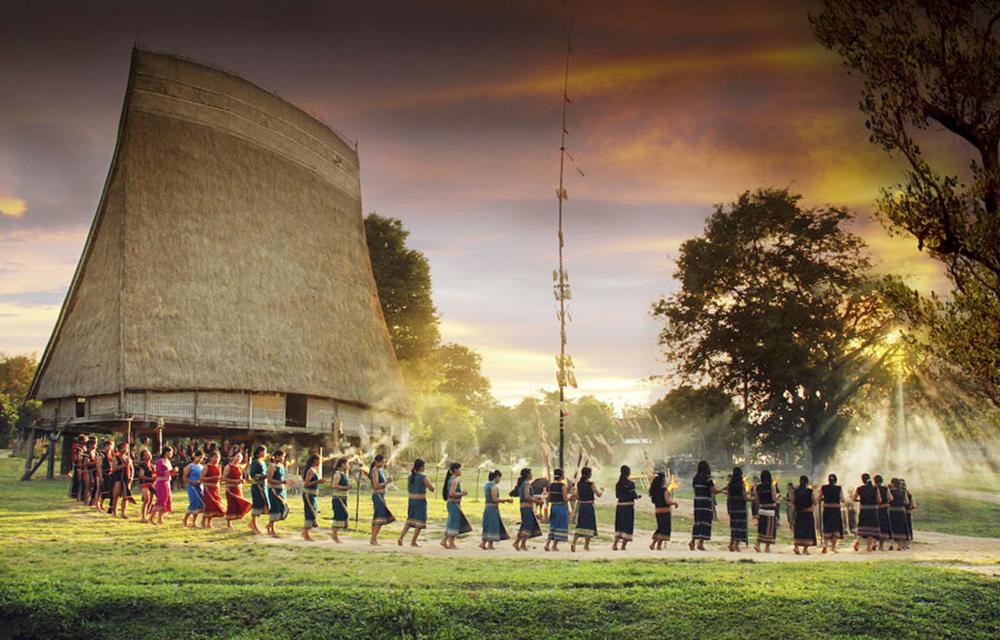 Buổi tối: Dùng bữa tối với cơm lam, thịt nướng, rượu ghè đặc sản tây nguyên. Giao lưu cồng chiên nhảy quanh ngọn lửa hồng cùng các người anh em đồng bào.
