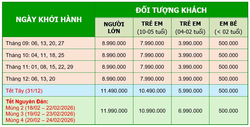 - Thanh toán hết 50% còn lại trước 5 ngày khởi hành.
