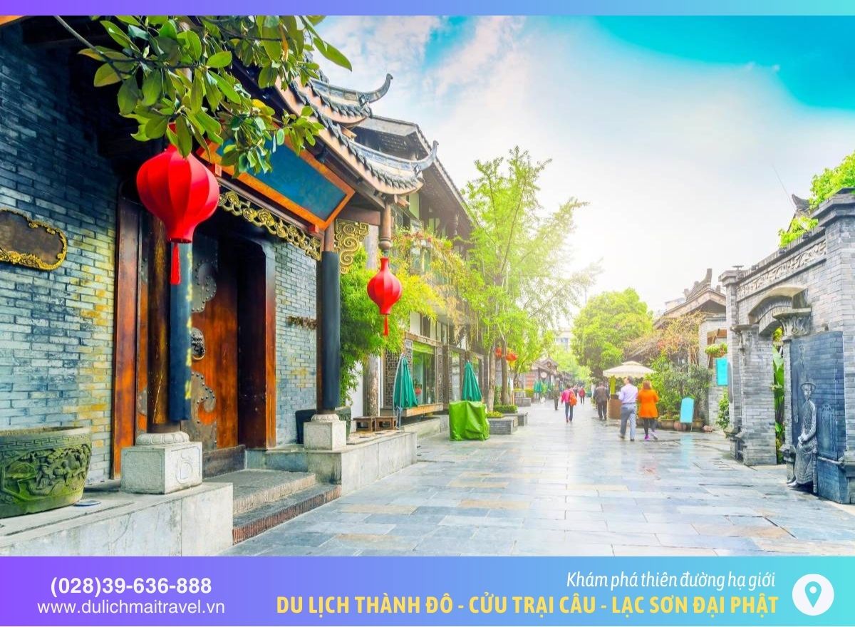 Buổi Chiều: Tham quan Ngõ rộng Ngõ hẹp (Kuanzhai Alley) – một trong những địa danh biểu tượng của Thành Đô, gồm ba con hẻm cổ: Kuan (rộng) – Zha (hẹp) – Jing (giếng). Dạo bước trên lối đi lát đá xanh, ngắm kiến trúc nhà cổ thời nhà Thanh, ghé quán trà truyền thống nhâm nhi trà phủ bát (covered-bowl tea), thưởng thức các món ăn vặt đường phố nổi tiếng như: bánh quẩy chiên giòn, đậu hũ thối cay, mì lạnh, bánh bao hấp nhân thịt, kẹo hồ lô… Không khí nhộn nhịp nhưng vẫn giữ nét thư thái đặc trưng của người Thành Đô.